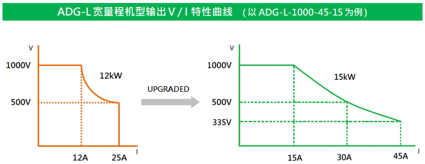 新一代 ADG-L系列的功率范圍與容量選擇擴充升級,具有三種輸出功率:5 kW、10 kW與15 kW、共計19款型號,取代上一代4 kW、8 kW與12 kW的14款型號,提供絕大多數(shù)負載所需之量測規(guī)格。其中更包含多個寬量程機型(Auto Range),相較于上一代的兩倍寬量程,新一代ADG-L系列,擁有三倍寬量程效果,可于較低壓輸出時,輸出較大的最大電流,提供客戶多元的選擇方案。