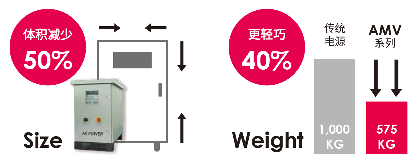 AMV 系列中頻電源,具備業(yè)界領(lǐng)先之體積及重量,比普遍市面上的電源,擁有更高的功率密度,體積相比最高可差至50%,重量更可差達(dá)40%,讓在產(chǎn)品安裝及移動上,更具彈性及方便性