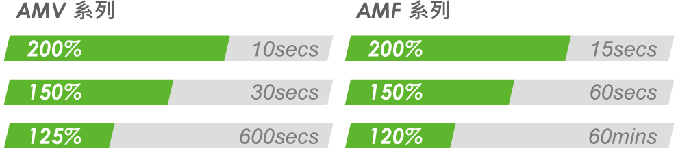 AMV 系列,具備125% /600secs、150%/30secs、200%/10sec AMF 系列,具備120% /60mins、150%/60secs、200%/15secs。