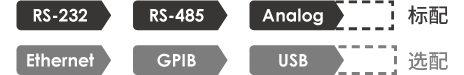 標(biāo)配 RS-232、RS-485、Ethernet、USB、Analog通訊接口,方便遠端監(jiān)控及編程,亦可選配GPIB,以滿足工業(yè) 4.0 自動化測試應(yīng)用的需求。