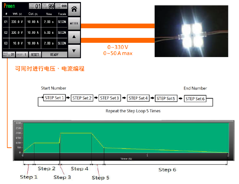 藉由 ADG-L 專屬的遠(yuǎn)程操作軟件,設(shè)置編程程序,輸入需求的電壓與電流值,使其重復(fù)循環(huán)、自動(dòng)跳停,并在計(jì)算機(jī)上同步觀察 LED 芯片的測(cè)試結(jié)果。