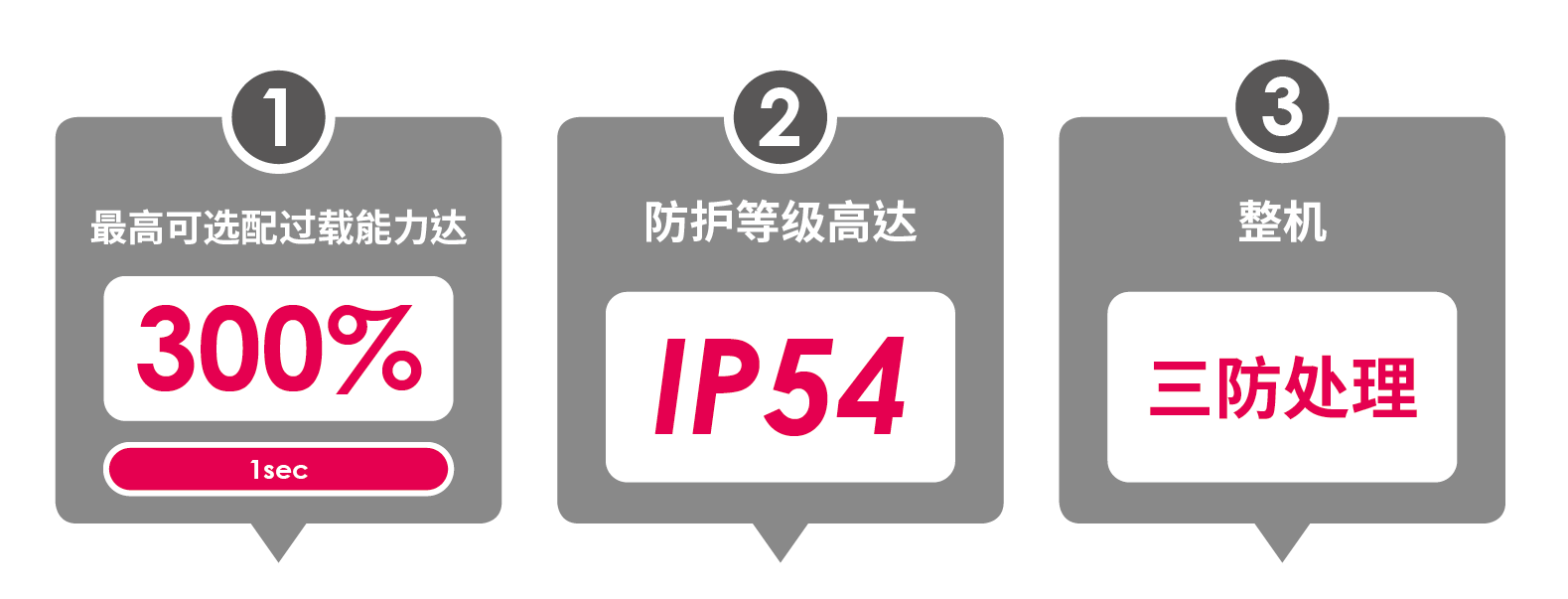 具備過載能力,125% /600secs、150%/30secs、200%/10secs,并可選配擴展的過載功能。